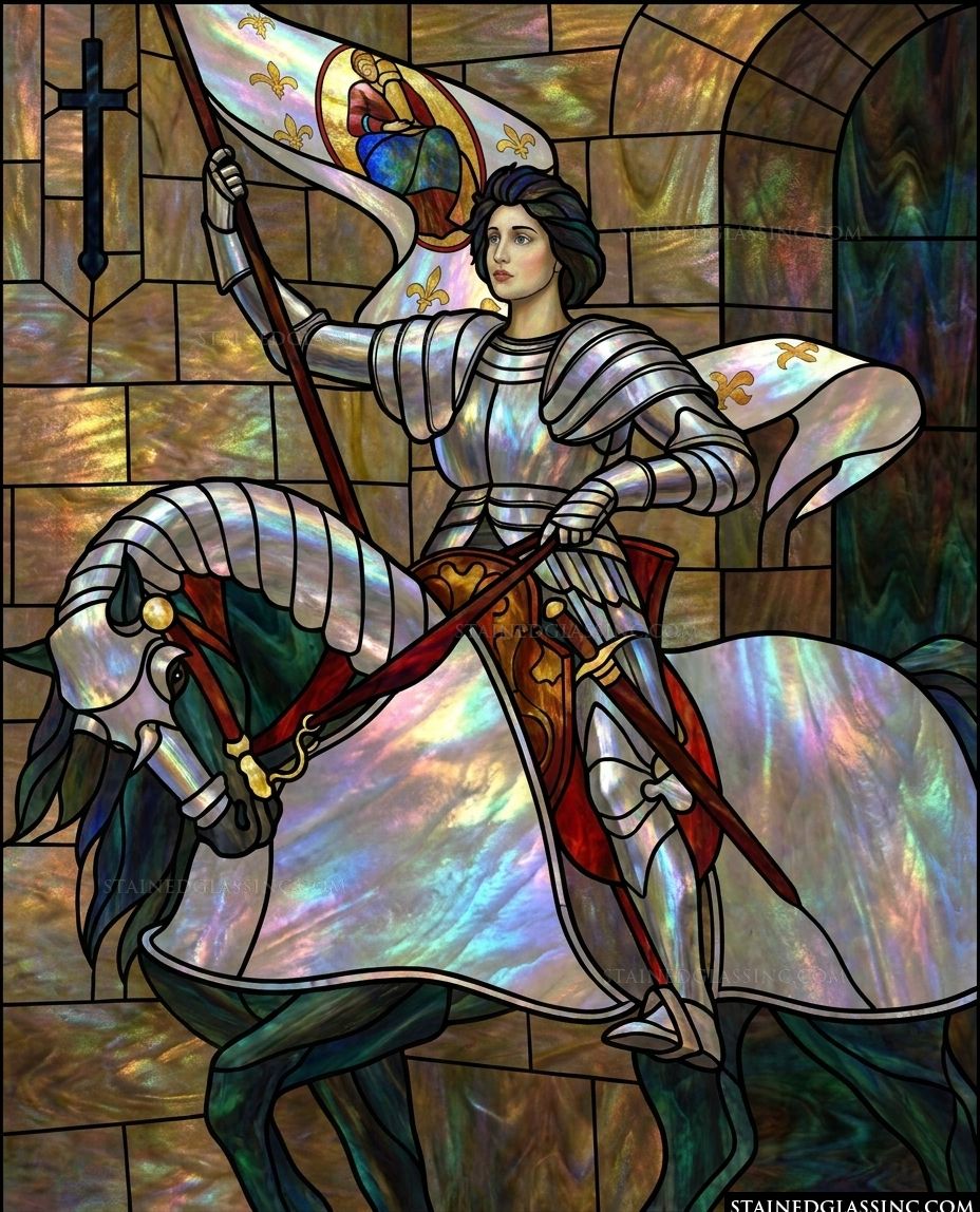 This inspiring stained-glass-style design brings the legendary Joan of Arc to life. Clad in intricately rendered armor that catches the light with iridescent depth, she is depicted as a determined warrior-saint, poised and resolute upon her noble horse.