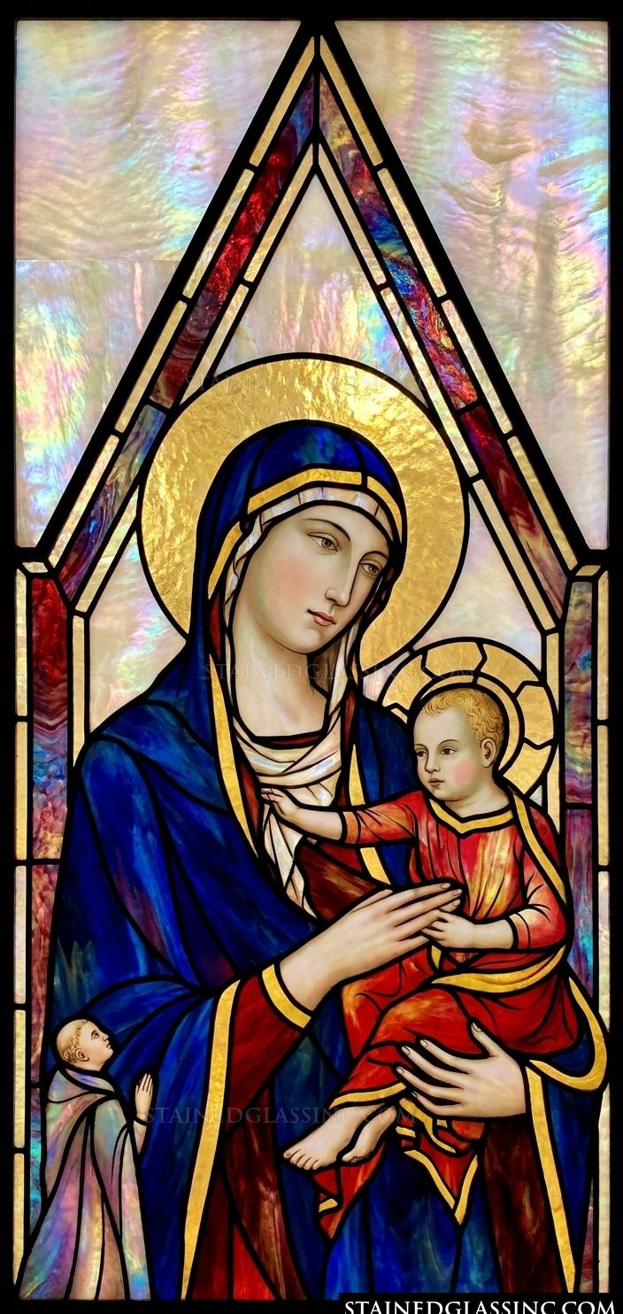 This captivating stained-glass-style design features a tender, classical composition of the Madonna cradling the Christ Child. The Virgin is depicted in a rich, deep blue mantle, symbolizing her traditional association with the heavens, while the Child is draped in vibrant crimson, representing his royal lineage and future sacrifice. Their calm, dignified expressions evoke a profound sense of peace and divine love.