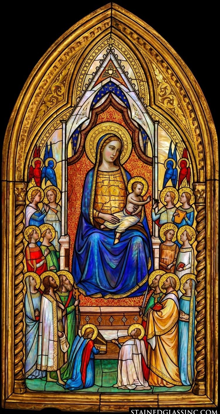 Surrounding the central figures, a gathering of saints and celestial angels pay homage, their figures rendered in an exquisite array of vibrant colors and elegant postures. The entire scene is framed by a sophisticated Gothic arch, featuring ornate, golden detailing that adds depth and structural beauty to the piece. This artwork brings a sense of sacred tranquility and timeless artistry to any space, glowing with the warmth and light of its masterful design.