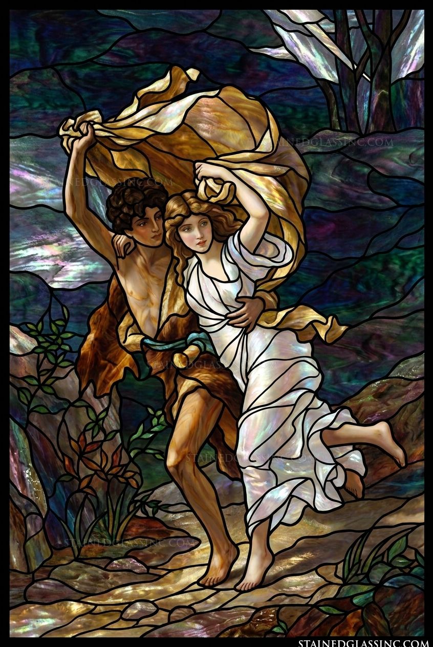 This captivating stained-glass-style design brings a classic mythological narrative to life with exquisite detail. A youth, draped in earthy tones, gathers a flowing golden mantle around both himself and his companion as they move swiftly through a shadowy, iridescent forest. The composition is charged with movement, capturing the fleeting moment of their departure.