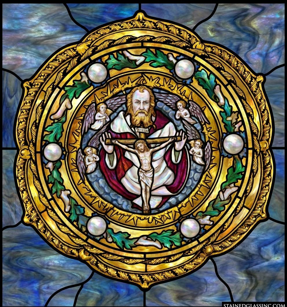 This luminous stained-glass-style design presents a deeply moving theological composition. At the heart of the circular medallion, God the Father is depicted with serene solemnity, his hands extended to support the cross where Christ is crucified. This powerful image of the Holy Trinity emphasizes the themes of sacrifice and eternal love, rendered with rich, glowing detail.