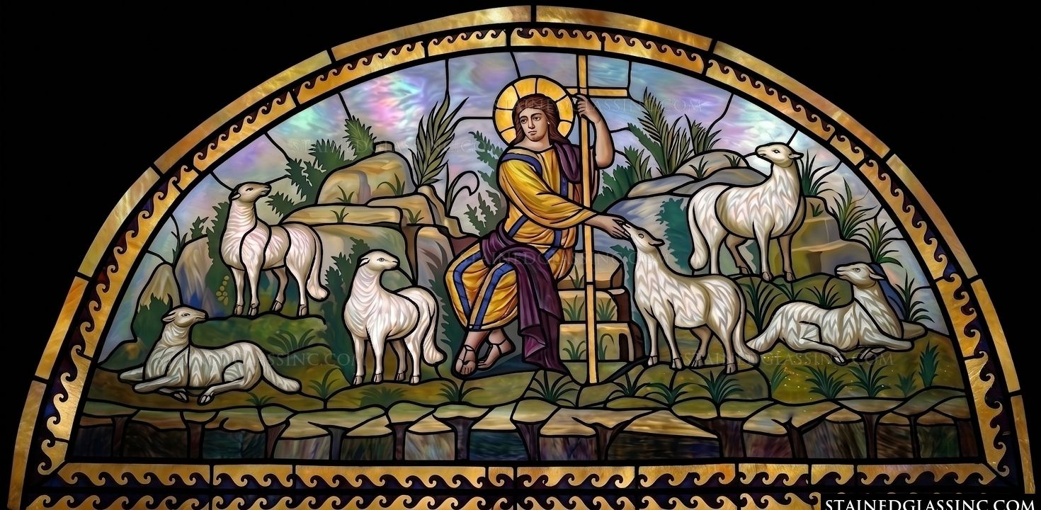 Radiant, glowing colors define the artistry, with rich gold and deep purple robes providing a striking contrast to the lush green hills and the pristine white of the gentle lambs. The arch-shaped composition adds a sense of grace and architectural elegance, making this a truly inspiring centerpiece for any sacred or reflective space.