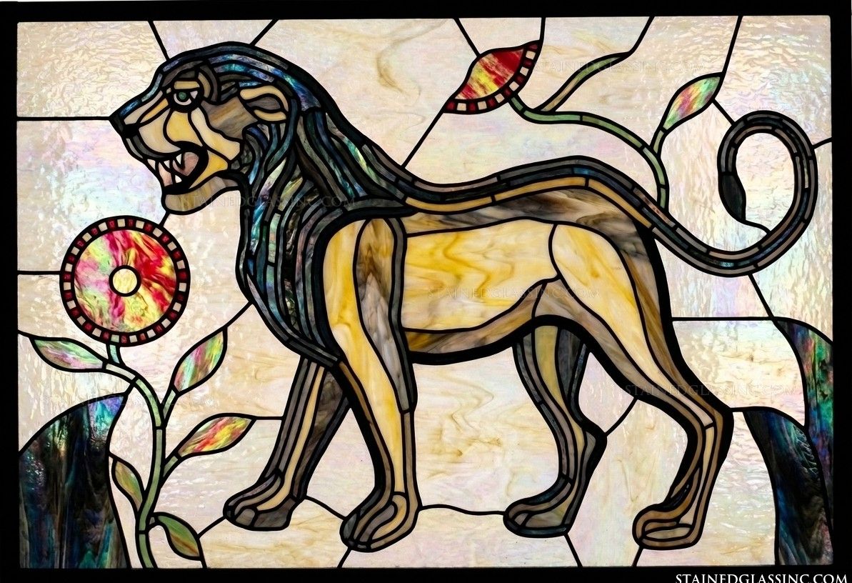 Capture the regal spirit of the wild with this captivating, stained-glass-style design. A powerful lion, rendered with artistic grace and flowing lines, takes center stage as he strides through a gentle, serene landscape. The composition is balanced by elegant floral motifs, creating a harmonious blend of strength and natural beauty.