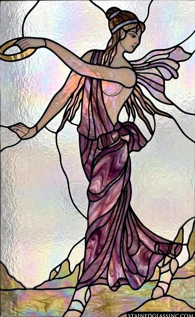 Embrace the grace of this captivating stained-glass-style design, which portrays an ethereal muse captured mid-dance. Her slender form is adorned in flowing, regal robes of rich, variegated plum and violet, suggesting both movement and soft, rhythmic elegance.