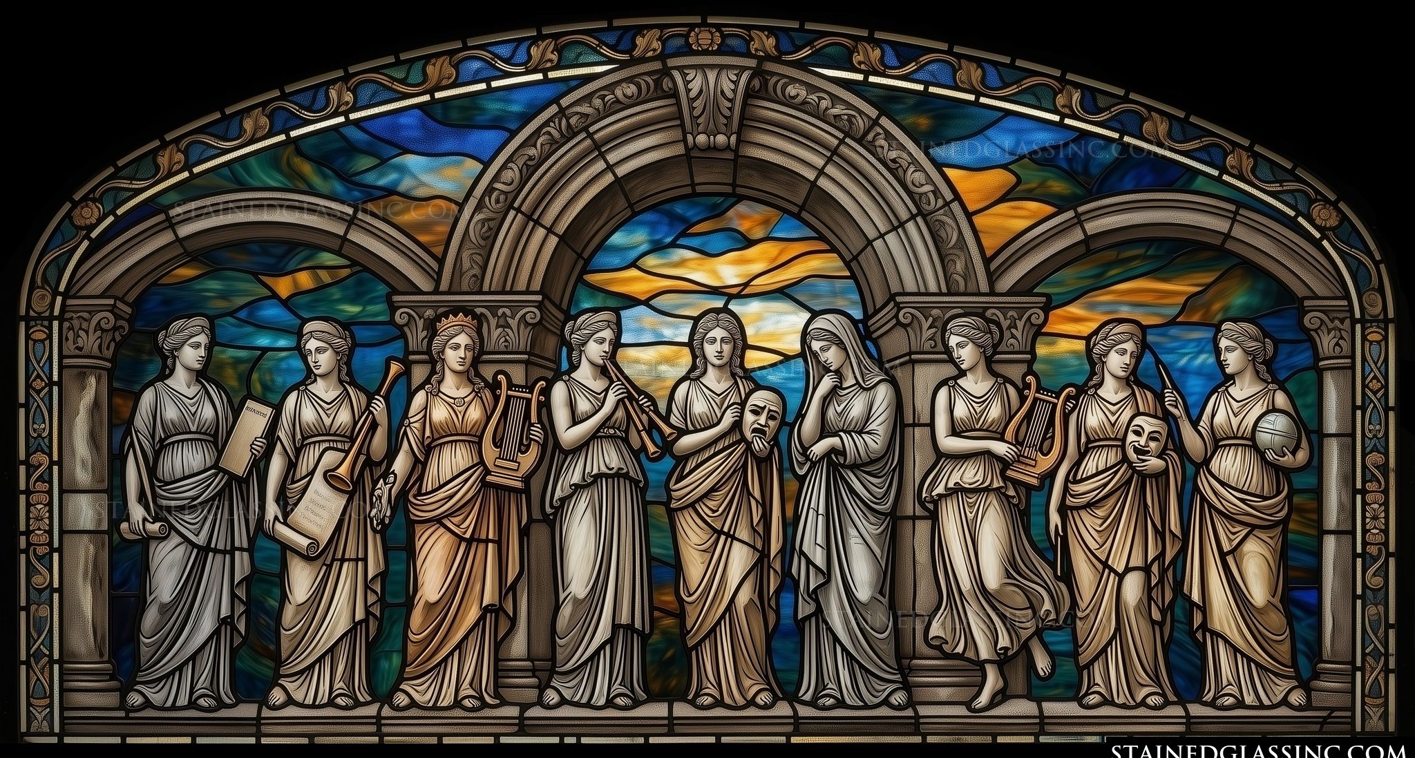 Embrace the timeless beauty of classical inspiration with this exquisite stained-glass-style design. Featuring the nine Muses in flowing, graceful drapery, the scene celebrates the foundational arts of music, theater, and literature. Each figure is rendered with meticulous detail, holding symbols of their creative domain, from lyres and masks to scrolls and globes.