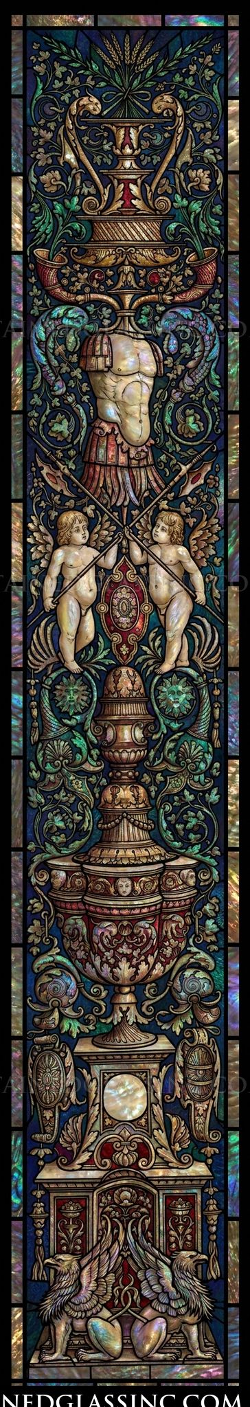 This exquisite stained-glass-style design captures the grandeur of the Renaissance through a masterful arrangement of classical symbols and ornamental motifs. At its heart, the artwork features a beautifully rendered trophy composition, elevated by the presence of playful cherubs who balance spears beneath a central figure. The depth of the composition is enhanced by the rich, glowing interplay of light and shadow, creating an atmosphere of timeless sophistication.