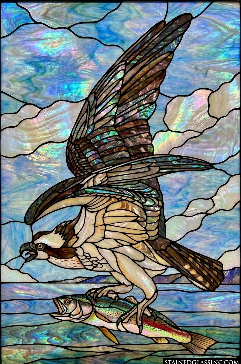 Experience the raw beauty of the natural world through this breathtaking stained-glass-style design. The scene depicts a magnificent osprey, mid-flight, having just secured its catch from the water below. Every feather is rendered with exquisite attention to detail, while the powerful posture of the bird conveys a sense of grace, strength, and the thrill of the hunt.