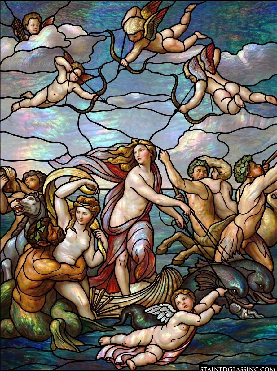 Immerse your space in the legendary beauty of the Triumph of Galatea. This breathtaking stained-glass-style artistry captures a vibrant mythological scene, where ethereal figures glide across a luminous sea. Rich, glowing colors bring the composition to life, from the deep oceanic blues to the soft, warm tones of the figures that seem to radiate from within.