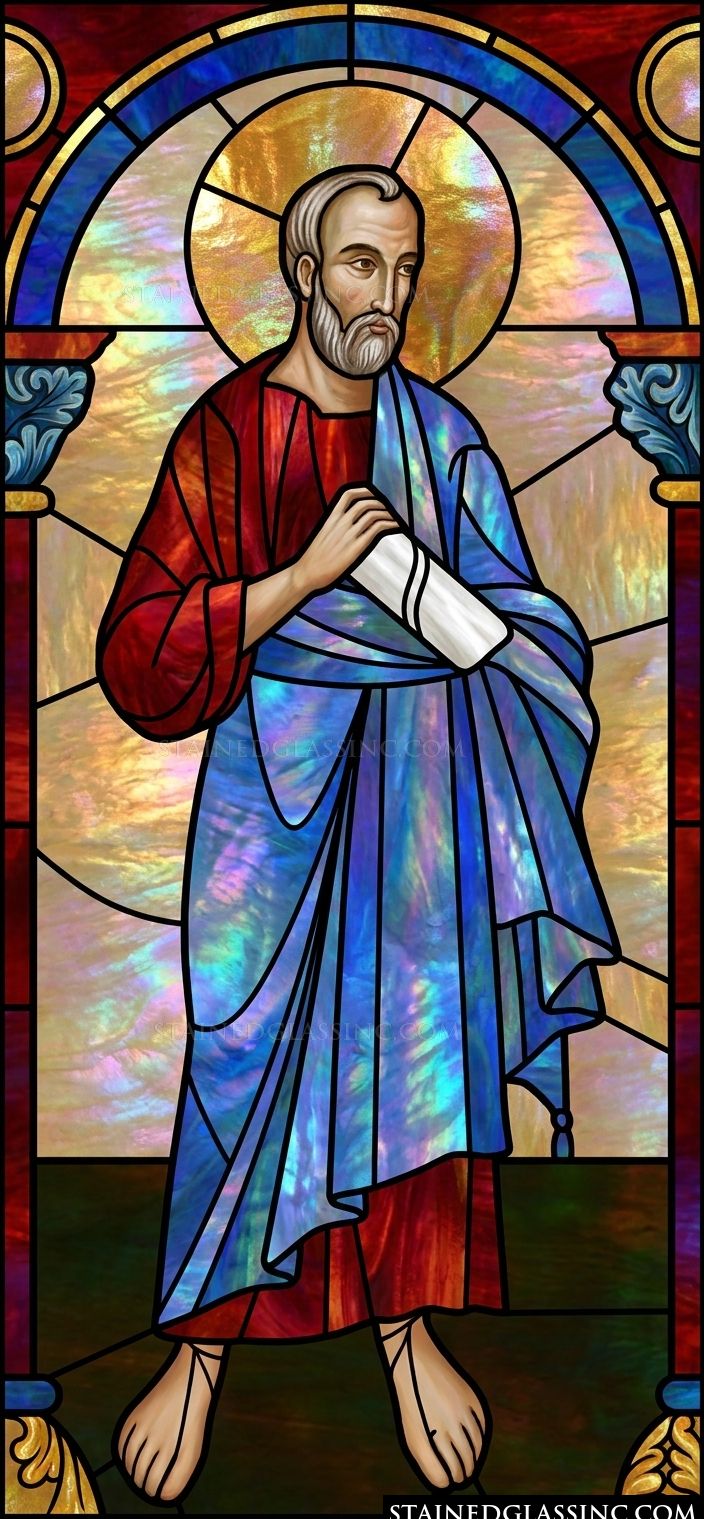 This captivating stained-glass-style design captures a moment of quiet contemplation and divine connection. The central figure, an apostle, stands with a dignified poise, holding a sacred scroll that symbolizes the eternal wisdom of the faith. His expression is one of calm assurance, drawing the viewer into a space of reverence and peace.