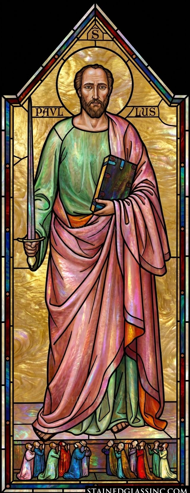 This luminous design portrays Saint Paul the Apostle with dignified grace. Clad in flowing robes of soft rose and sage green, he stands against a radiant, golden backdrop that evokes a sense of divine inspiration and eternal light. His steady gaze and authoritative presence command attention, while the iconic sword he carries symbolizes both his unwavering defense of the faith and the historic martyrdom he endured.