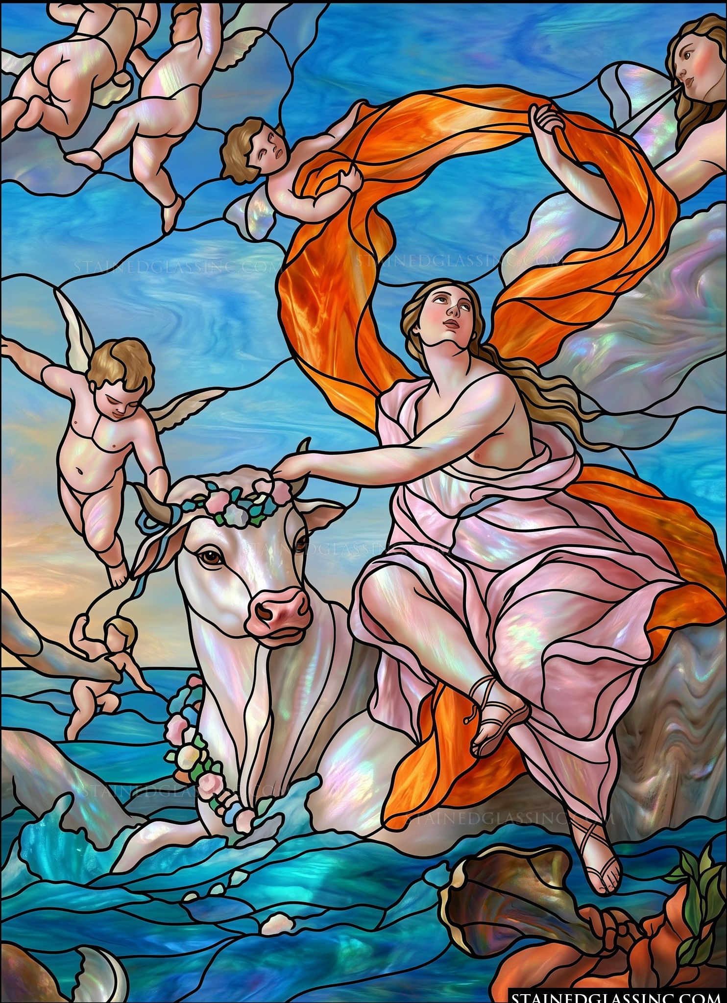 Embrace the enchanting allure of classical mythology with this vibrant stained-glass-style design. The artwork captures the dramatic and celebrated scene of Europa crossing the sea, elegantly perched upon the back of a noble white bull. Their journey is surrounded by a playful group of cherubs, adding a sense of whimsical grace to the sweeping composition.