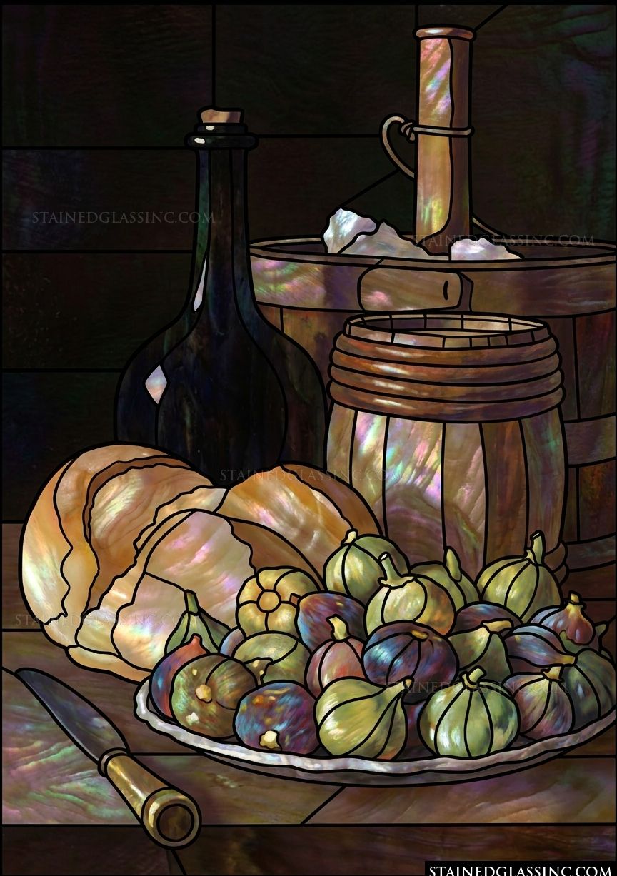 The scene is balanced by rustic wooden barrels and an elegant, dark bottle, suggesting a timeless preparation for a shared meal. This stained-glass-style design radiates an inviting, earthy charm, making it a perfect addition to any dining space or kitchen looking for a touch of rustic elegance and artistic depth.