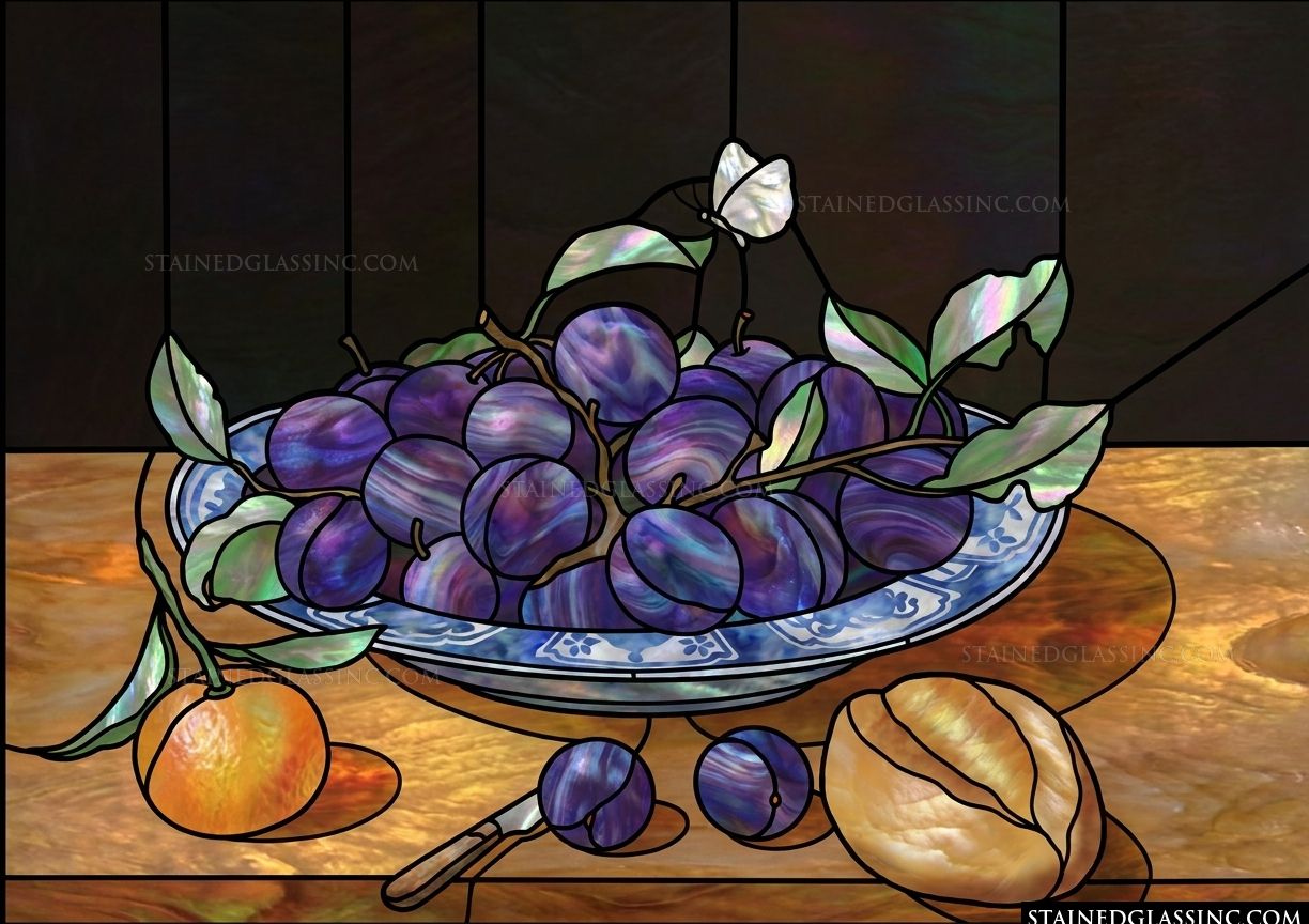 Experience the quiet beauty of a classic kitchen scene with this evocative, stained-glass-style design. A central, ornate bowl overflows with rich, swirling purple plums, their deep hues perfectly complemented by the luminous, iridescent green leaves and a delicate butterfly resting atop the fruit.