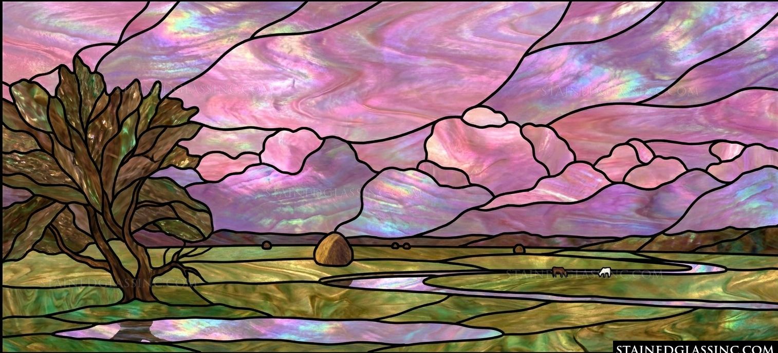 Escape to a peaceful countryside retreat with this breathtaking stained-glass-style artistry. The scene captures the quiet magic of twilight, where a winding river meanders through lush, rolling fields, reflecting the vibrant, swirling hues of a dreamlike purple and iridescent sky. A solitary tree stands sentinel on the left, its branches reaching gracefully across the horizon, creating a sense of serene, timeless elegance.