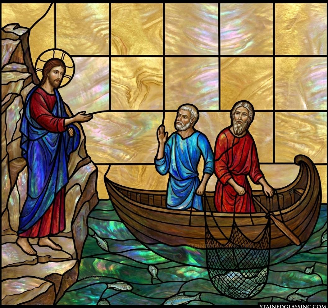 This evocative stained-glass-style design captures a foundational moment in sacred history: the calling of the disciples. Jesus is depicted standing firmly on the rocky shoreline, his hand extended in a gesture of invitation and authority, directing the fishermen toward their new path. His figure radiates presence, contrasting with the humble, working world of the boat.