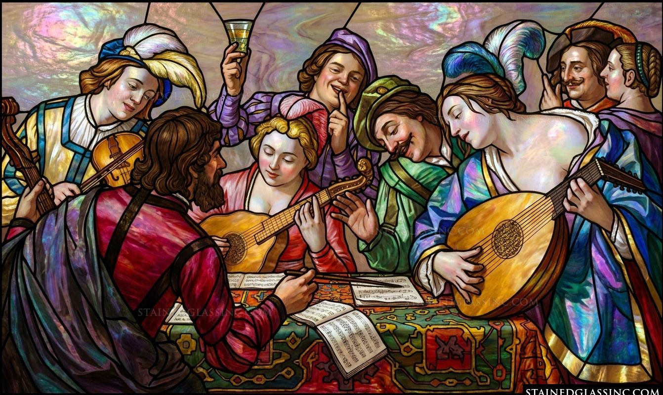 Step into the warmth and camaraderie of a Renaissance musical gathering. This radiant design captures a moment of pure creative joy, featuring a group of musicians and revelers immersed in song and melody. From the intricate detailing of the lutes and violins to the expressions of shared delight, every element invites you into a timeless scene of elegance and harmony.