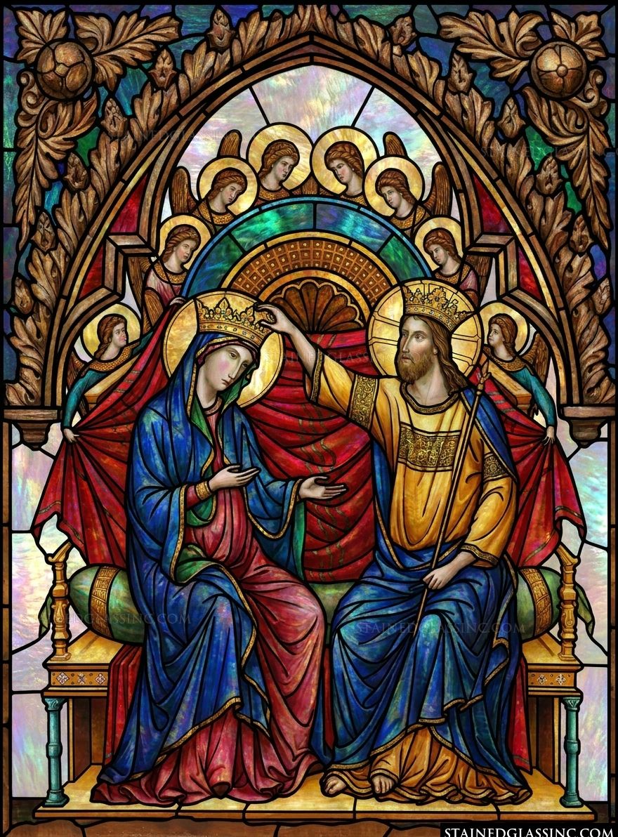 This majestic stained-glass-style artistry captures the sublime moment of the Coronation of the Virgin. Christ, dressed in royal robes and holding a golden scepter, gently places a crown upon the head of Mary, who sits beside Him in humble adoration. Their figures are rendered in deep, rich tones of cobalt blue and crimson, creating a regal and timeless composition.