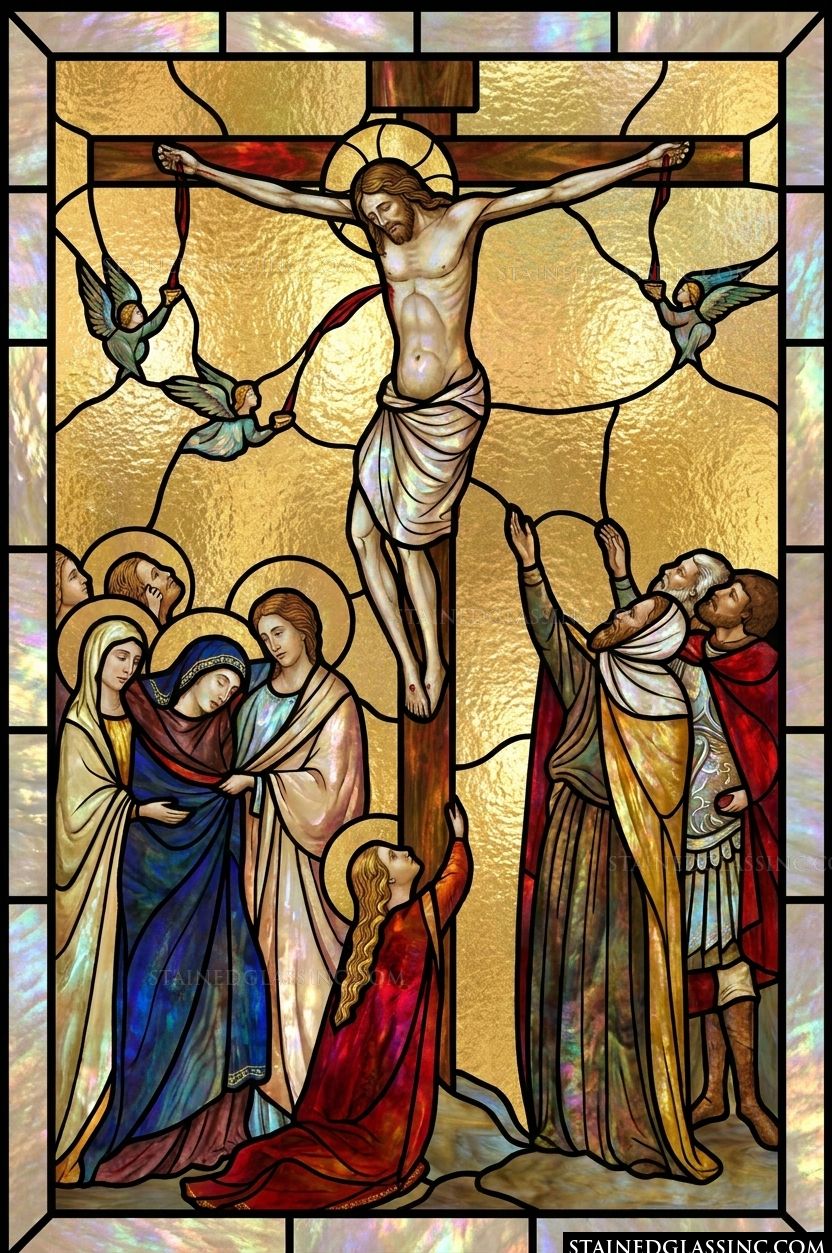 This moving stained-glass-style design captures the solemnity of the Crucifixion with breathtaking artistry. Christ hangs centrally upon the cross, his form rendered with grace and dignity. Above, delicate angels gather in a luminous golden sky, their ethereal presence adding a layer of celestial sorrow and reverence to this sacred scene.
