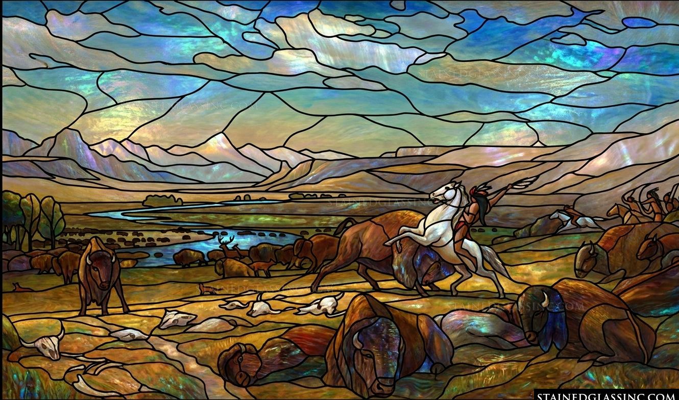 Experience the raw power and majesty of the untamed frontier in this stunning stained-glass-style design. The scene captures a powerful moment of movement, featuring a mounted hunter amidst a herd of bison, all set against a backdrop of rolling, distant mountains and a winding river.