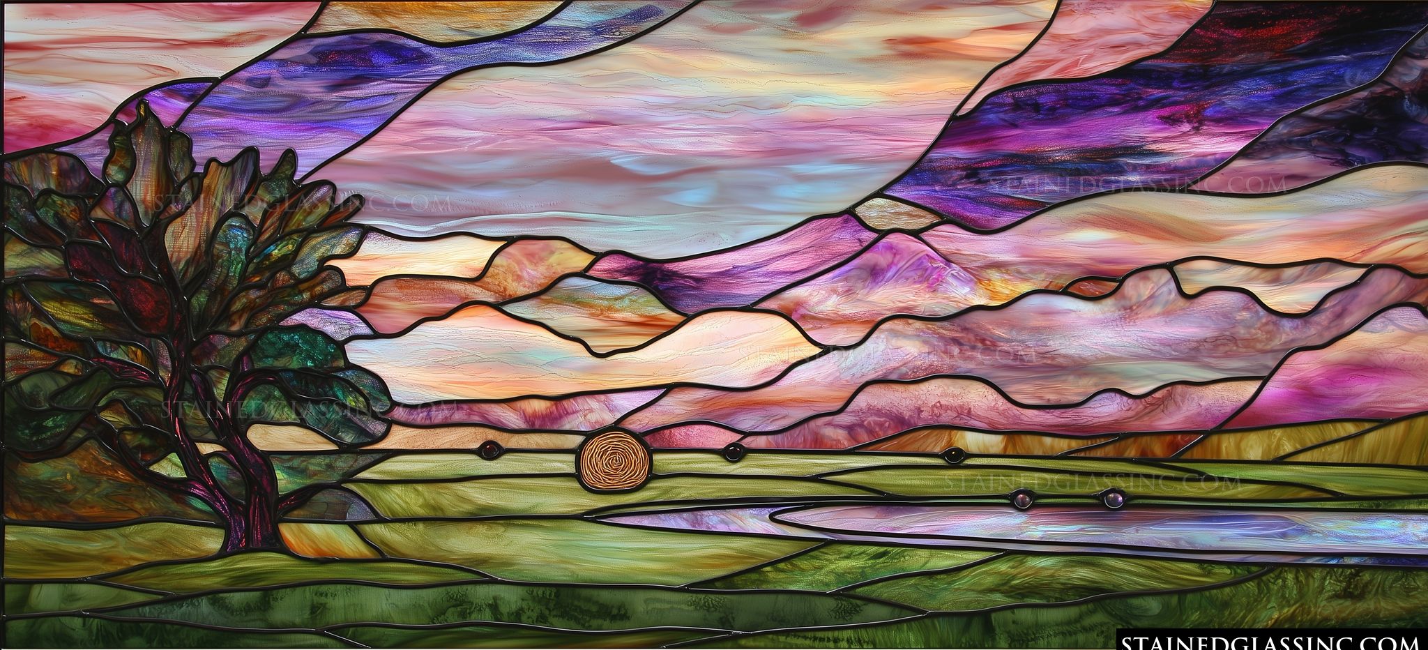 Embrace the quiet beauty of a countryside evening with this breathtaking stained-glass-style design. The composition centers on a solitary, sturdy tree standing watch over expansive, gently rolling hills, evoking a profound sense of peace and stillness. The play of light across the landscape creates a harmonious balance between the grounding earth and the expansive, dreamlike horizon.