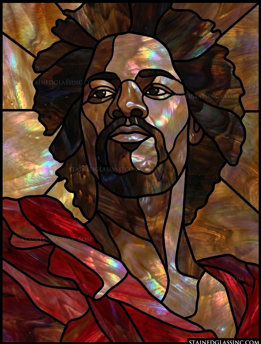This captivating portrait of A Chief of Abyssinia is rendered in a stained-glass-style design that radiates warmth and tranquility. The composition features a serene and contemplative expression, brought to life through a rich palette of deep ambers, glowing coppers, and vibrant reds that suggest a divine presence.