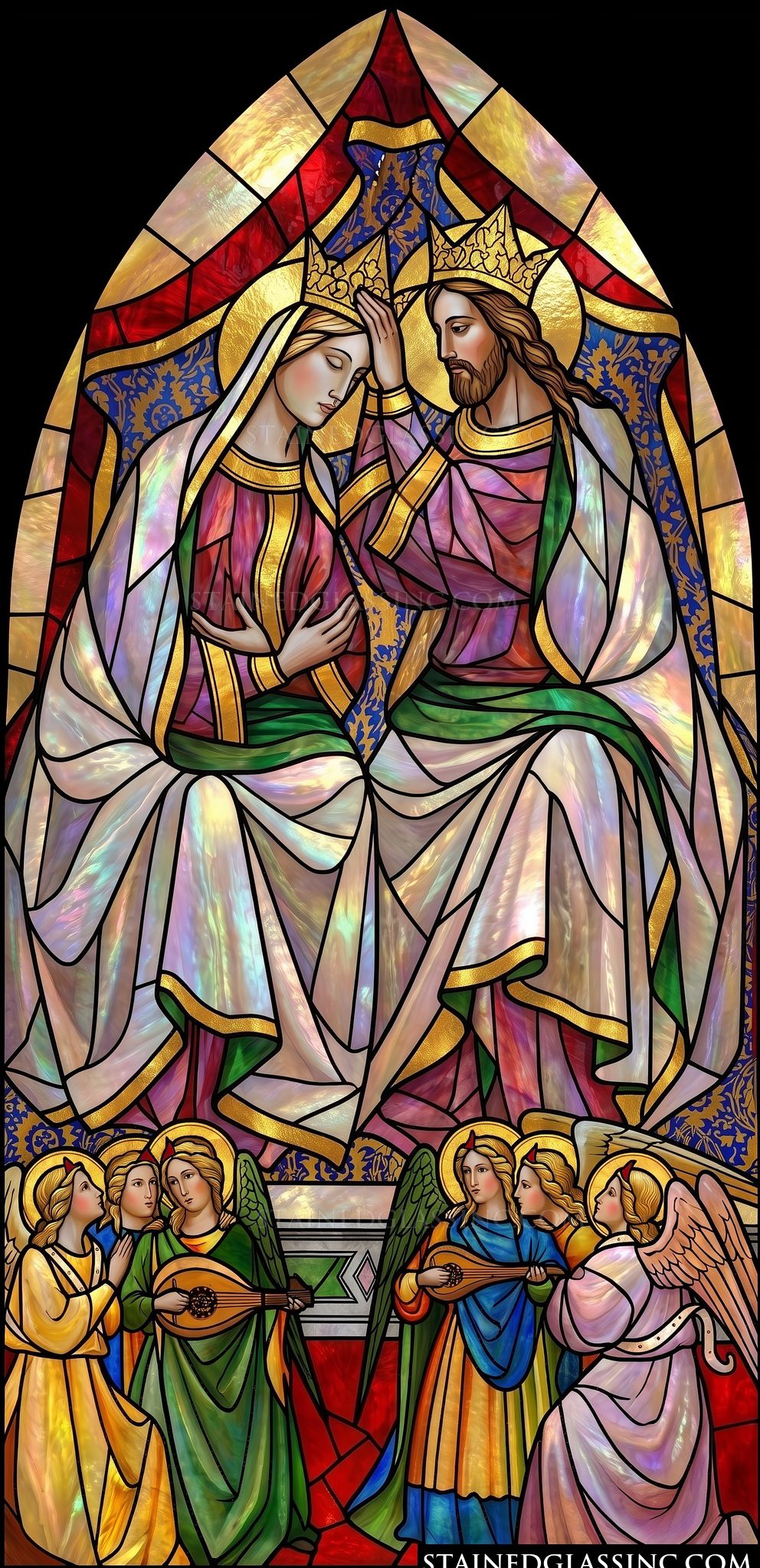 This exquisite stained-glass-style design beautifully captures the Coronation of the Virgin, a moment of profound grace and eternal royalty. Christ, depicted with a gentle expression and noble bearing, reaches out to place a crown upon the head of Mary, who bows with humble reverence. Their flowing, opalescent robes and rich, regal colors imbue the scene with an ethereal glow that elevates any sacred space.
