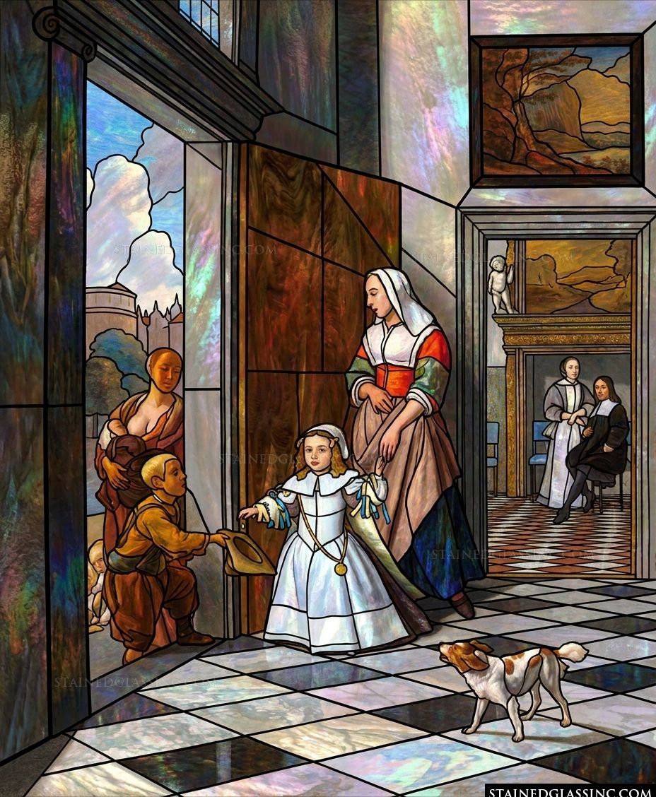 This exquisite stained-glass-style artistry depicts a beautifully detailed scene of an unexpected encounter. A small, noble child in elegant, light-colored attire is guided by a maternal figure, their gentle interaction contrasted by a young visitor arriving at the threshold. Every element is brought to life through a rich palette of deep, warm earth tones and luminous highlights, giving the entire design a sense of depth and historical charm.