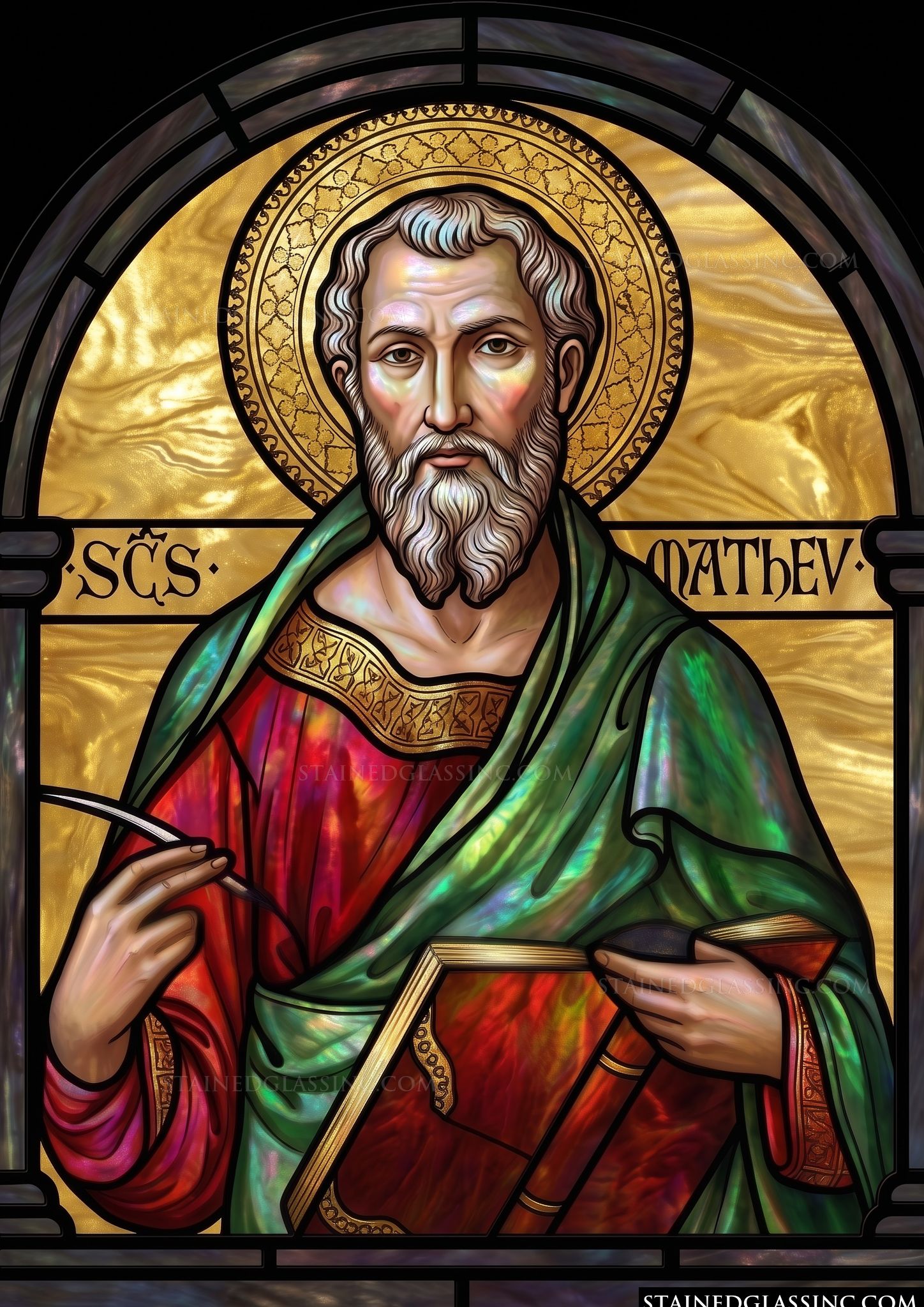 This exquisite stained-glass-style design captures the solemn dignity of Saint Matthew the Evangelist. Clad in vibrant crimson and deep green, he is portrayed in a moment of holy focus, holding a quill and his sacred book, ready to record the word of God. The rich, golden background creates a radiant, ethereal glow that illuminates the figure and highlights his contemplative expression.
