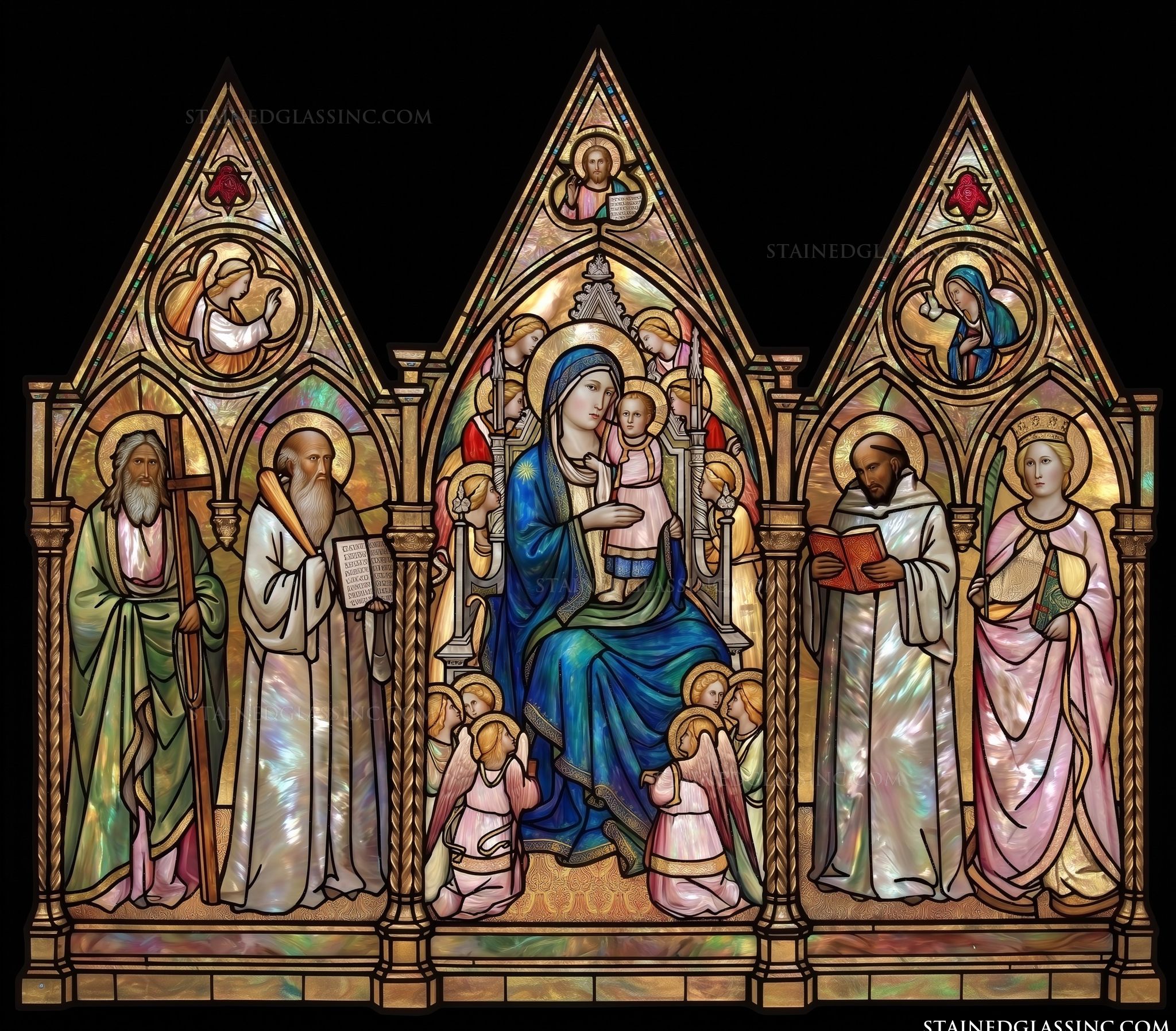To either side, the design pays homage to a group of saints, each rendered with thoughtful detail and dignity. Their reverent poses and symbolic attributes invite quiet contemplation, making this piece a powerful addition to any space dedicated to faith and reflection. The harmonious balance of figures and the rich, glowing palette evoke the timeless artistry of a classic sanctuary masterpiece.