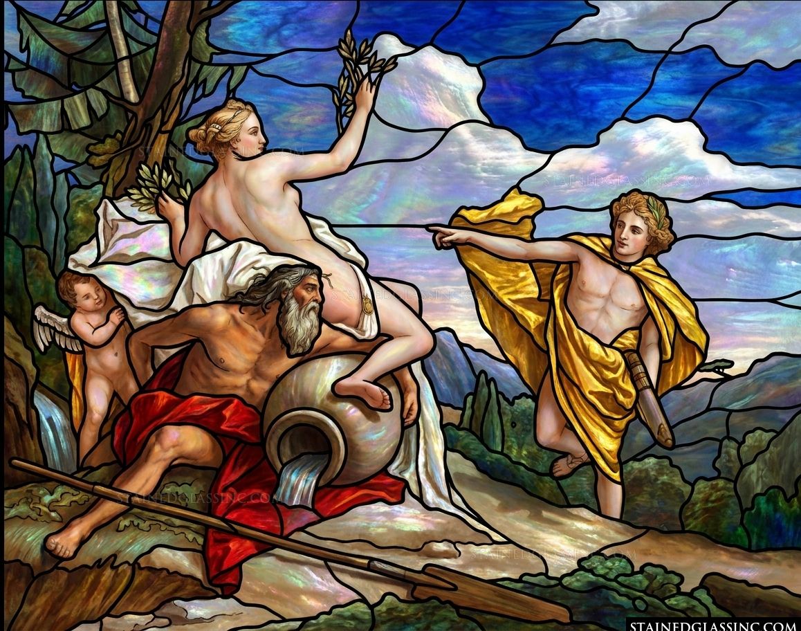 This stunning stained-glass-style design presents a dynamic mythological tableau. The scene is anchored by a bearded figure pouring water from a large vessel, beside a graceful reclining woman holding a branch, while a youthful, golden-robed figure gestures commandingly toward the horizon. The composition is filled with movement, depth, and a sense of classical drama that evokes the spirit of historical fine art.