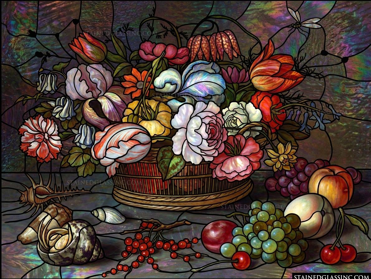 Complementing the floral display is a classic still life arrangement of seasonal fruit and intricate seashells, grounded by a serene, artful aesthetic. The interplay of light across the textures of grapes, cherries, and patterned shells creates a captivating visual depth. This stained-glass-style artistry offers a refined, heartwarming focal point that celebrates the richness and variety of the natural world.